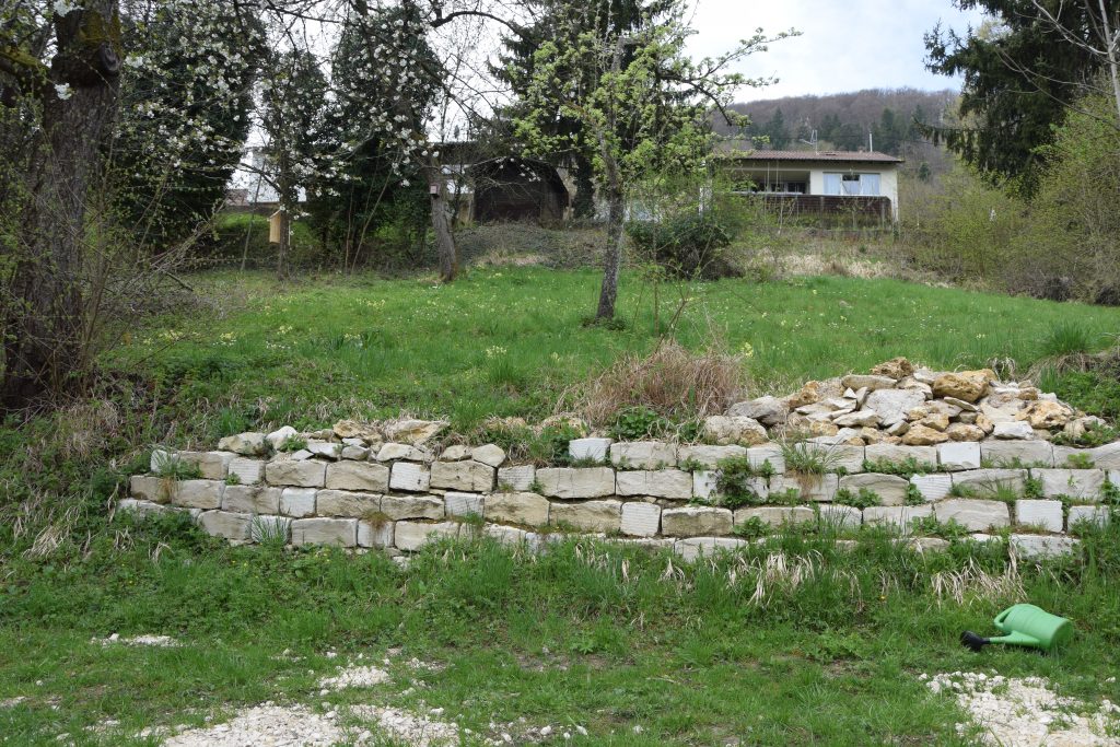 An geeigneten Stellen haben wir weitere kleine Habitate geschaffen. So wurde beispielsweise an einer sehr steilen Wegböschung einer Wiese eine Trockenmauer aufgebaut, die bereits nach kurzer Zeit von Zauneidechsen angenommen wurde. Daraufhin wurde ein weiterer Steinriegel aufgeschichtet, der ebenfalls sofort von Zauneidechsen besiedelt wurde. Von älteren „Unterhausenern“ haben wir erfahren, dass es in ihrer Kindheit in dieser Gegend viele Schlangen gab. Wir sind gespannt, wann wir hier die ersten Schlingnattern beobachten können.